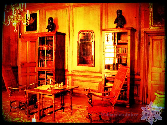 沙發與黑的發亮的茶几,靠牆的義大利古董書櫃是很深的咖啡色,真木的紋裡清析可見,橢圓形的鏡子用金色的古典畫框框起,各種顏色毫不失真,但失去陽光的室