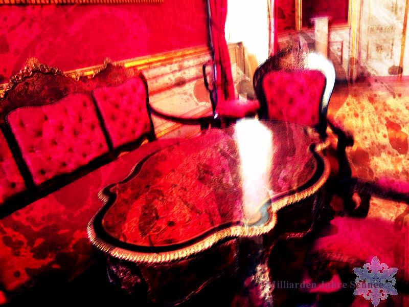 她沒想到這隻Marionette會說話,在她想事情的時後他已經把門打開了,她的行李已經放在一進門的客廳中,黃色的燈光配上桃紅的燙金壁紙感覺十分溫暖,裝潢也都以紅色系為主,綴以金飾顯的富麗唐皇,沙發採用的紅底的刺鏽花卉,坐起來相當舒服,茶几上放著新鮮的大紅玫瑰,都是新藝術風的檜木彩繪家俱。雖然是客房,卻強烈的透露出是為女性使用者設計的感覺,抬頭可以看到放射花型的吊燈,天花版上還有彩繪花朵壁飾,相當講究。 Marionette把桌上的”守護天使”布偶拿起來,原來在它厚重的裙下藏著一壺飄著酸甜香氣的水果茶,把茶壺拿起,杯子就在它的下半部。